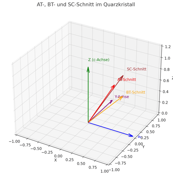 Questa spiegazione descrive gli assi cristallografici di un cristallo di quarzo sintetico e i diversi tipi di taglio (taglio AT, BT e SC) utilizzati nella produzione di cristalli di quarzo.